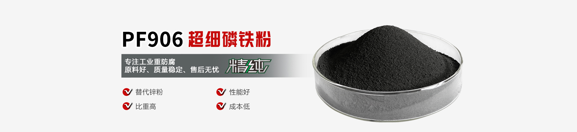 PF906超細磷鐵粉選用本公司優勢產品——精煉磷鐵,聯合科研單位共同開發,采用進口設備加工而成,粒度可達500至1200目。無毒,無臭,無異味;導電性、導熱性良好,耐高溫500C至1320°C;具有防腐蝕、耐磨,附著力強等優點。可顯著改進涂膜性質及重防腐富鋅涂料焊接特性,減少富鋅涂料焊接切割產生的鋅霧,改善工作環境,提高勞動保護水平。