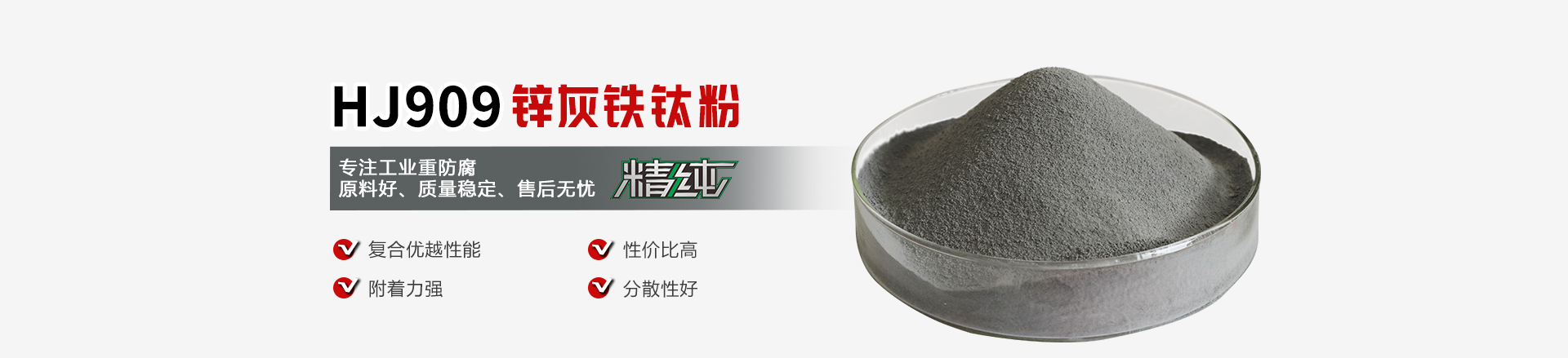 HJ909鋅灰鐵鈦粉是以超細(xì)磷鐵粉為載體,復(fù)合一定量的無毒顏料經(jīng)過表面高溫包覆處理和復(fù)合屏蔽性基料共同作用而成。通過多種有機(jī)助劑對超細(xì)粉體及顏料表面進(jìn)行高溫處理,使其在顏料表面形成致密的包覆層,能有效阻隔水分子、氧氣及其他氣體對鋼鐵的侵蝕,極大增強(qiáng)了顏料在鋼鐵表面的附著力,從而具備了優(yōu)良的防銹能力。